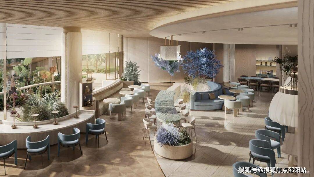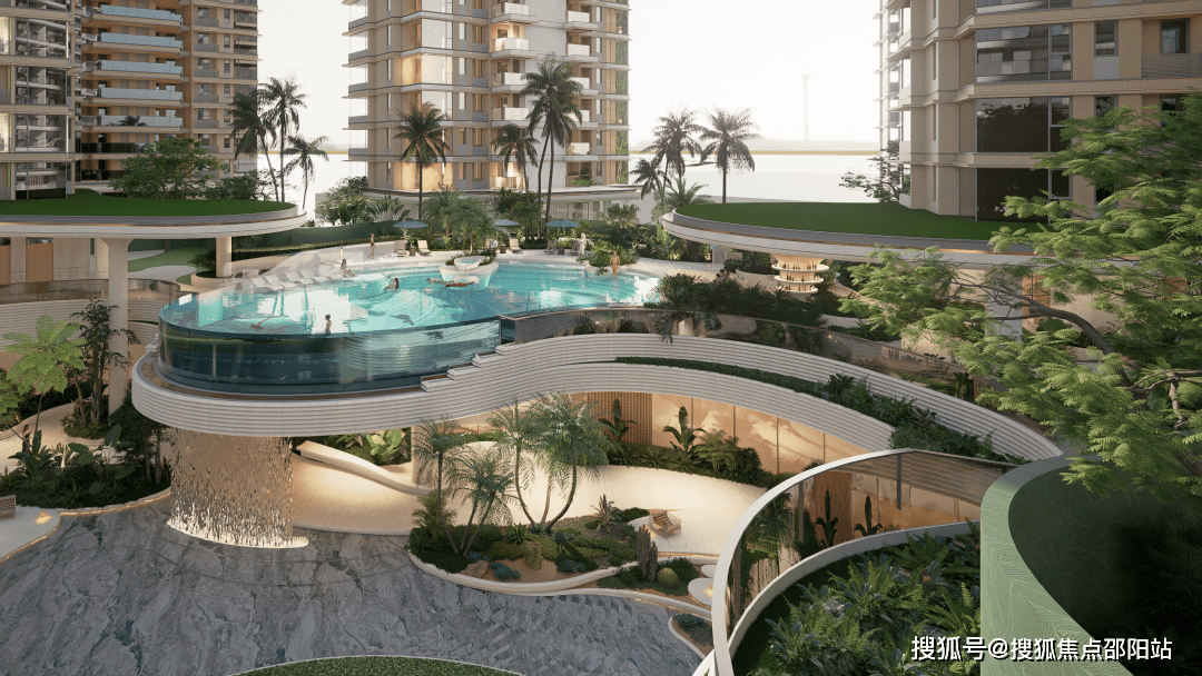 以超前手法打造约320㎡无边际悬空泳池,通过流水叠瀑连接负一层会所,于此可举办落日派对、池边社交,生活场景由此无限延伸。
